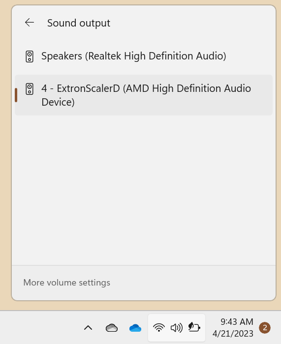 - Since HDMI is capable of carrying sound, you'll need to switch your playback device to "ExtronScalerD (AMD High Definition Audio Device)"