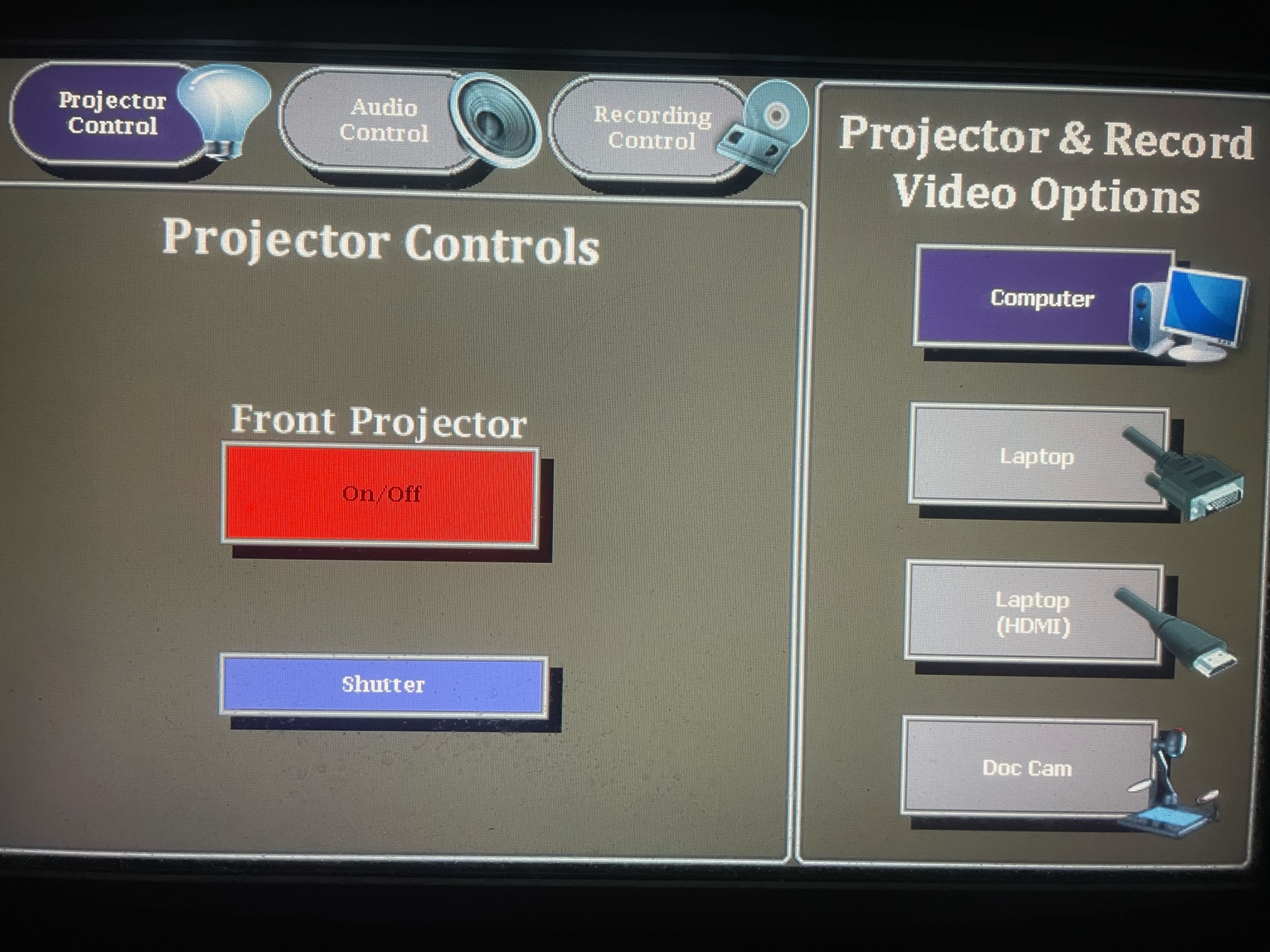 - If problems still persist, restart the Crestron system by toggling the projector off and switching video inputs.
