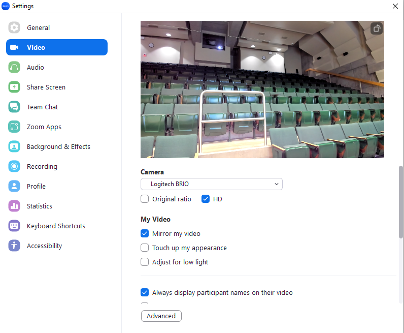 In MH 101, the Zoom audio and video settings should be configured like below:
